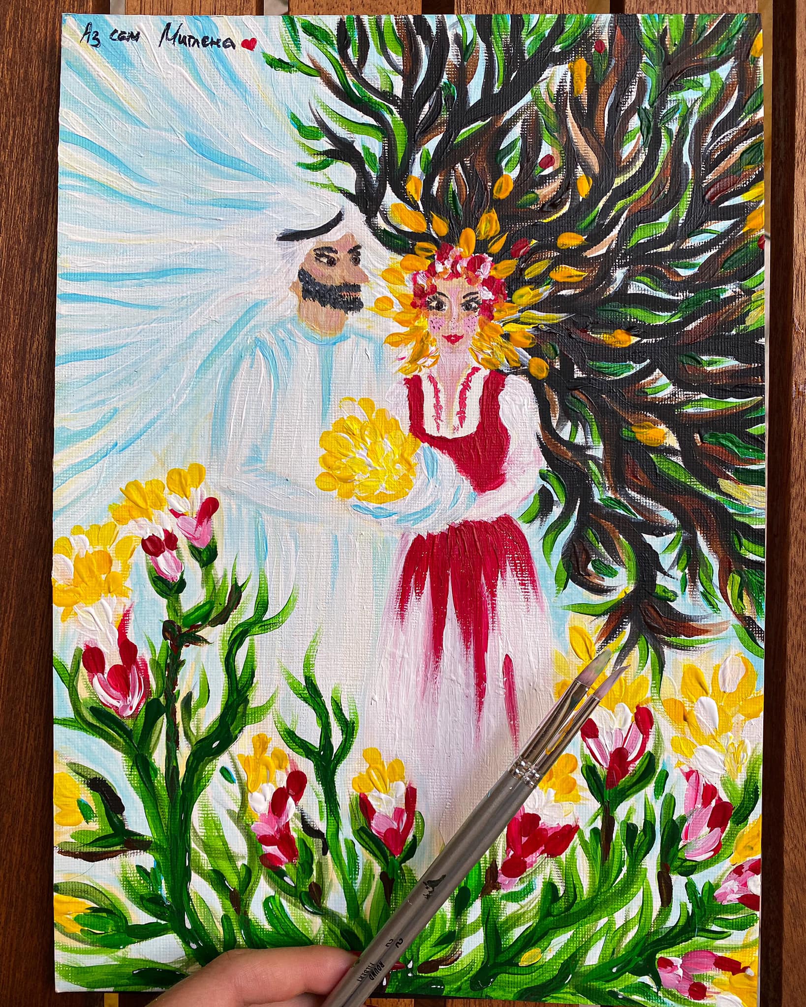 Скандалната дизайнерка публикува в социалния си профил своя картина, на която е нарисувала себе си в прегръдките на арабина. Тя е облечена в българска народна носия, а той – в типичната за арабите роба – кандура, пише "Шоу.бг".