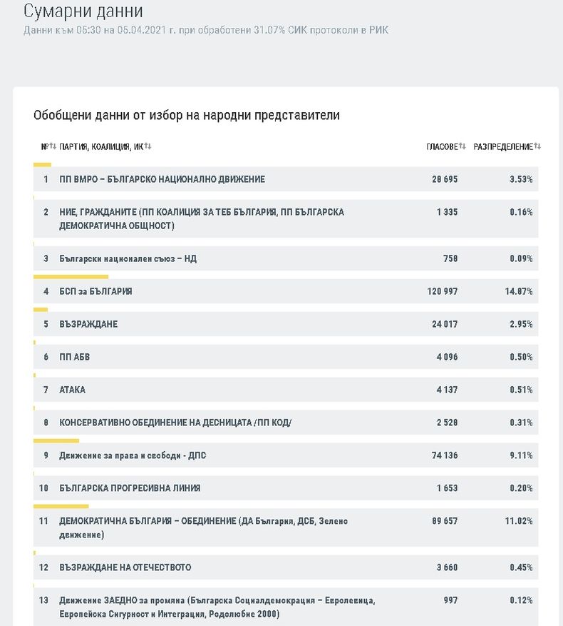 Междинните данни при 31,07% въведени протоколи, съобщени към 05:30 часа показват, че в новия парламент влизат шест политически формации: