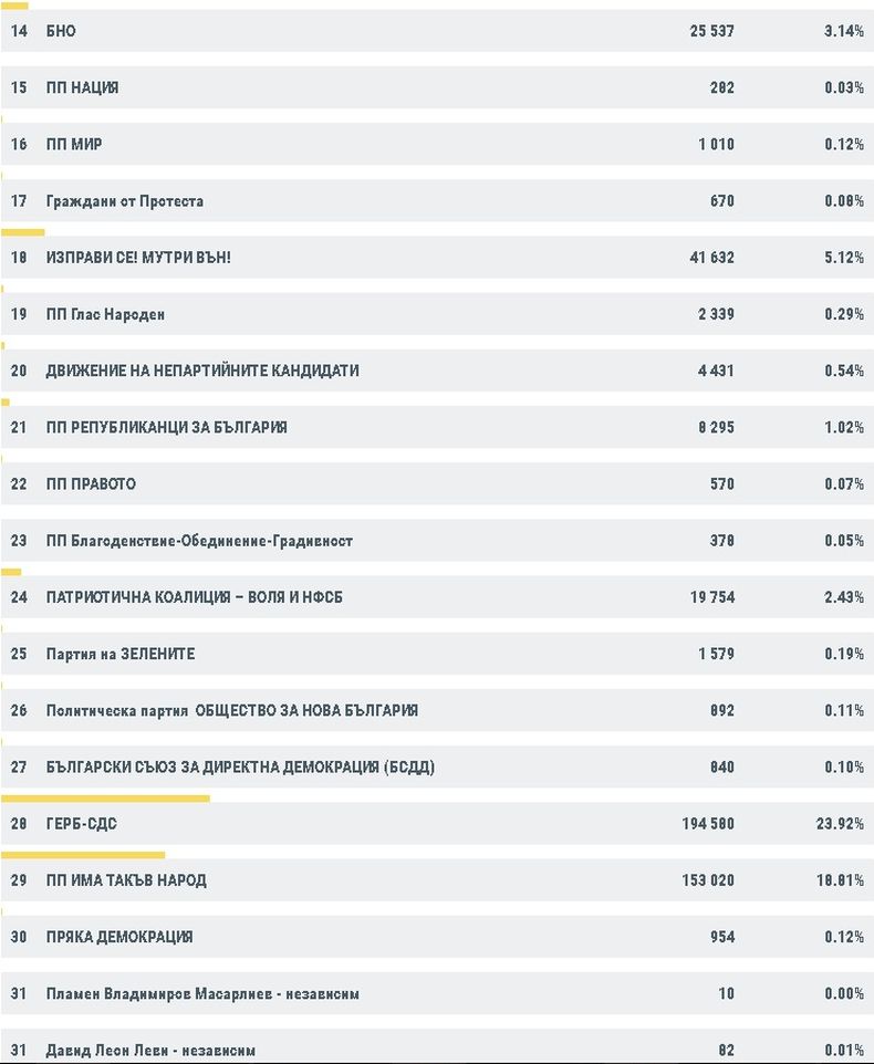 Междинни резултати при обработени 31,07% СИК протоколи в РИК: Води ГЕРБ-СДС с 23,92 %, пред „Има такъв народ” с 18,81 % и БСП с 14,87%