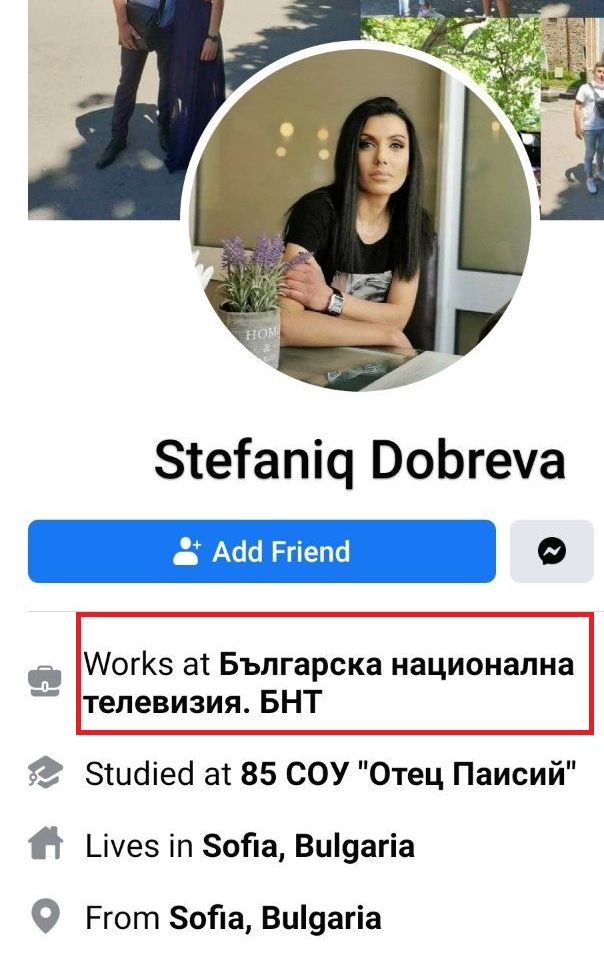 Иначе публично Стефания Добрева се представя като служител на БНТ, което е поредната й лъжа. Наша проверка показа, че никога не е работила в телевизията, а просто е отговаряла за доставките на храна в БНТ.