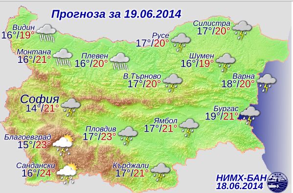 През следващото денонощие ще бъде облачно, с валежи от дъжд, в следобедните часове – придружени от гръмотевици и временно усилване на вятъра. По-значителни ще са валежите в източната половина от страната.