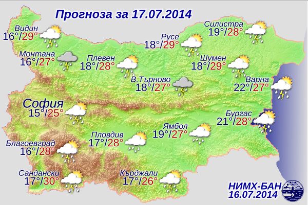 Повече ще са валежите в следобедните часове и преди полунощ, и в Северна България и планините. Температурите ще останат без съществена промяна, максималните ще са между 25° и 30°. Атмосферното налягане ще е около средното за месеца.