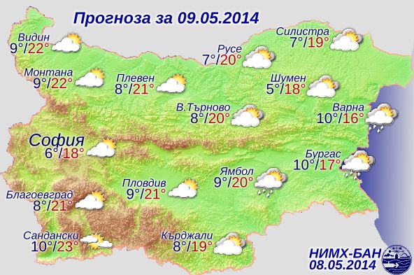 В останалата част от страната облачността ще е разкъсана, а вятърът ще е слаб. Максималните температури ще са предимно между 18° и 23°, в София 18°. Минималните сутринта ще са между 5° и 10°. Атмосферното налягане ще е по-ниско от средното за месеца.