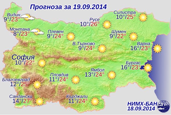 Утре вече времето ще бъде предимно слънчево, а вятърът до обяд и по Черноморието ще отслабне. Дневните температури ще са с 2-3° по-високи, максималните в повечето места между 21° и 26°. Сутринта на места в низините и котловините видимостта ще бъде намалена. Атмосферното налягане ще е по-високо от средното.