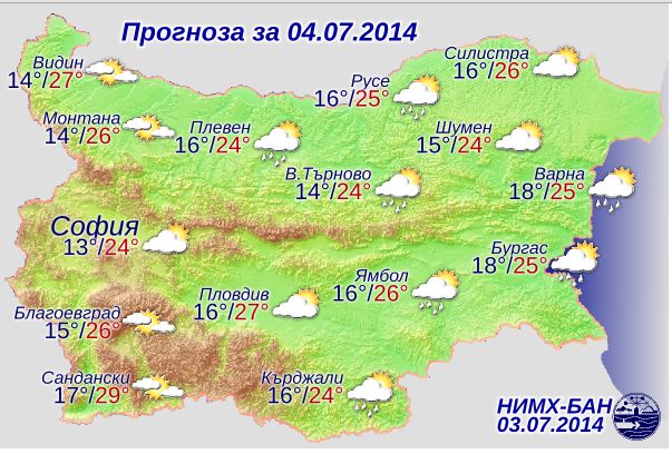 Утре вятърът ще се ориентира от север-североизток, ще е слаб, в източните райони – умерен. Над западната половина на страната ще преобладава слънчево време. Над източната ще има временни увеличения на облачността и на отделни места там ще превали. Максимални температури между 24° и 29°. Атмосферното налягане остава по-високо от средното за юли.