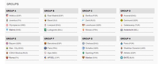 Водачи на групите бяха Реал (Мадрид), Барселона, Байерн, Челси, Бенфика, Атлетико, Арсенал и Порто.