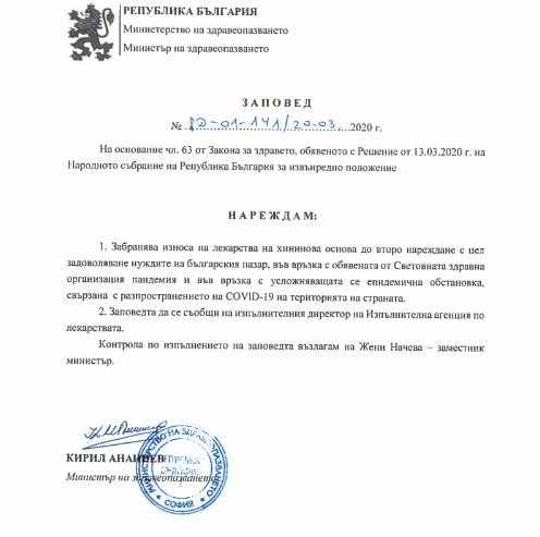 Министърът на здравеопазването издаде заповед, с която се забранява износът на лекарства на хининова основа до второ нареждане. Целта е да бъдат задоволени нуждите на българския пазар във връзка с обявената от СЗО пандемия и усложняващата се епидемична обстановка, свързана с разпространението на COVID-19 на територията на България.