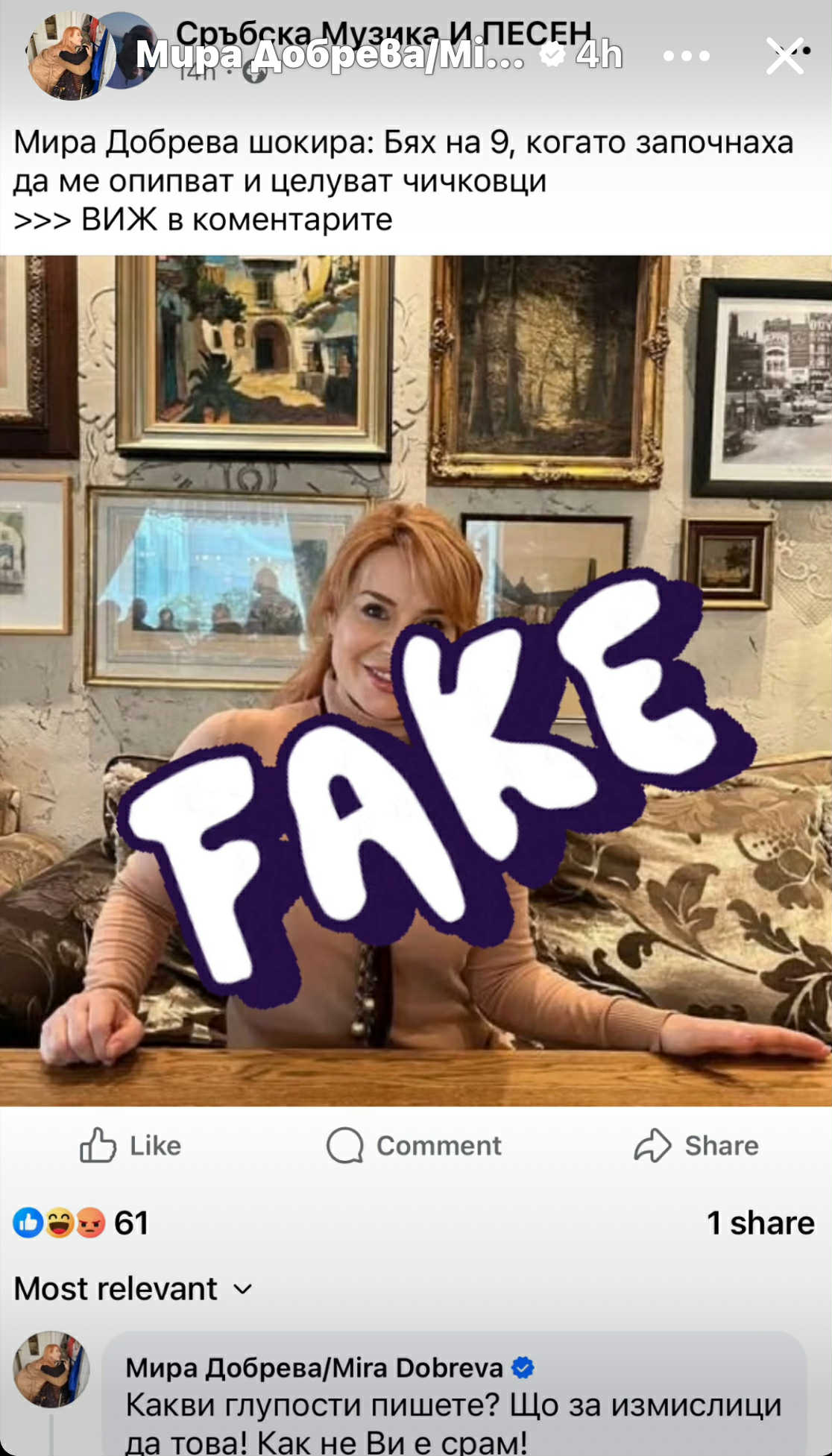 Пак измислици! Пак лъжи по мой адрес! Жълти сайтове, докога ще слагате думи в устата ми? Така бившата водеща от БНТ Мира Добрева избухна на страницата си във Фейсбук тази сутрин.