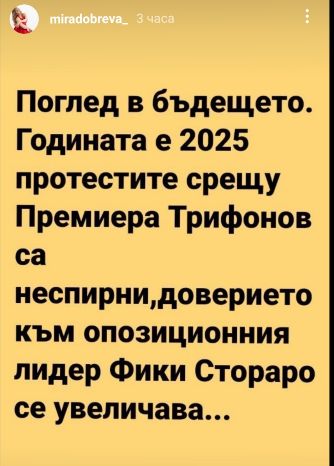 Ето какво гласи сторито й: "Поглед в бъдещето. Годината е 2025 протестите срещу Премиера Трифонов са неспирни, доверието към опозиционния лидер Фики Стораро се увеличава...".