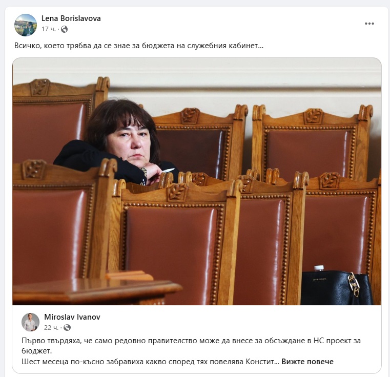 Малко по-късно Лена Бориславова сподели поста му, като отгоре написа единствено: "Всичко, което трябва да се знае за бюджета на служебния кабинет…"