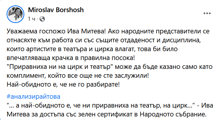 Експертът по темите на културата Мирослав Боршош захапа Ива Митева за репликата и как парламентът е превърнат в "цирк".