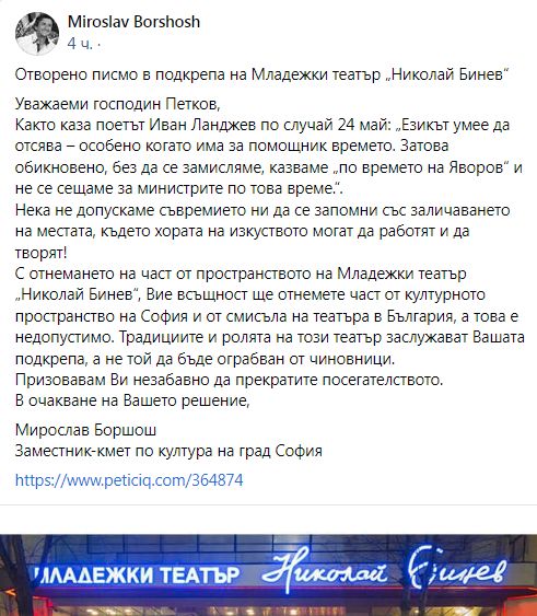 "Нека не допускаме съвремието ни да се запомни със заличаването на местата, където хората на изкуството могат да работят и да творят!" това пише в отворено писмо до премиера Петков Заместник-кметът по култура в София Мирослав Боршош. Апелът е в подкрепа на Младежкия театър.
