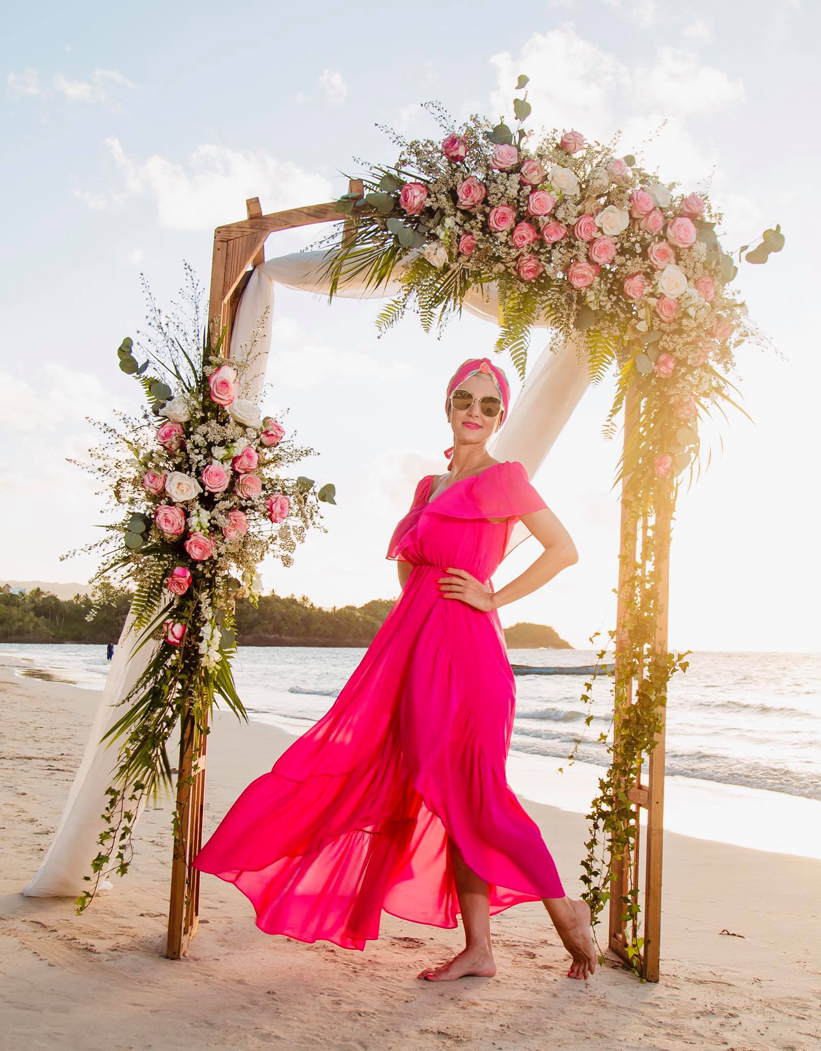 В заговора е участвала и дизайнерката София Борисова, с чиято рокля Руснала каза "Да" на своя любим, на фона на залеза в Доминикана.