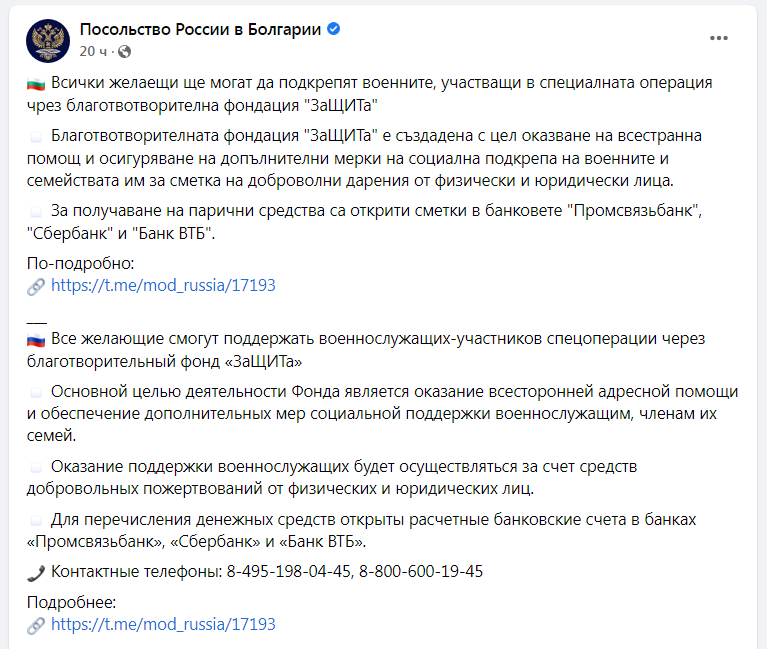 На официалната Фейсбук страница е публикуван призив на посланик Елеонора Митрофанова, адресирано до "всички желаещи" за финансова подкрепа на руснаците, който е илюстриран с лентичка, във формата на буквата Z.
