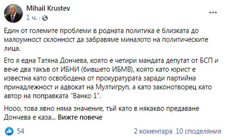 "Един от големите проблеми в родната политика е близката до малоумност склонност да забравяме миналото на политическите лица. Ето я една Татяна Дончева, която е четири мандата депутат от БСП и вече два такъв от ИБНИ (бившето ИБМВ), която като юрист е известна като освободена от прокуратурата заради партийна принадлежност и адвокат на Мултигруп, а като законотворец като автор на поправката “Ванко 1”. Това написа в профила си във "Фейсбук" анализаторът Михаил Кръстев.