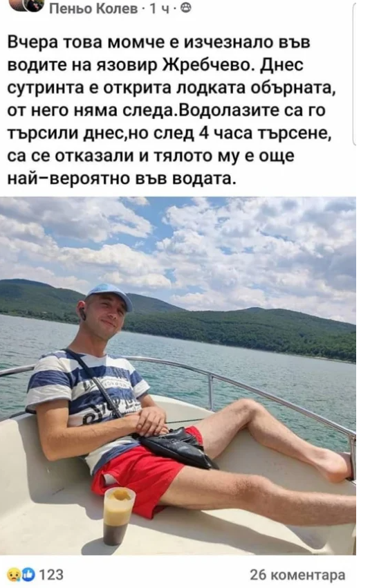 "Пиша този пост с апел за помощ от доброволци, които да се включат в издирването на едно младо момче. На 02.10.2022 отива за риба с лодката си на язовир Жребчево.