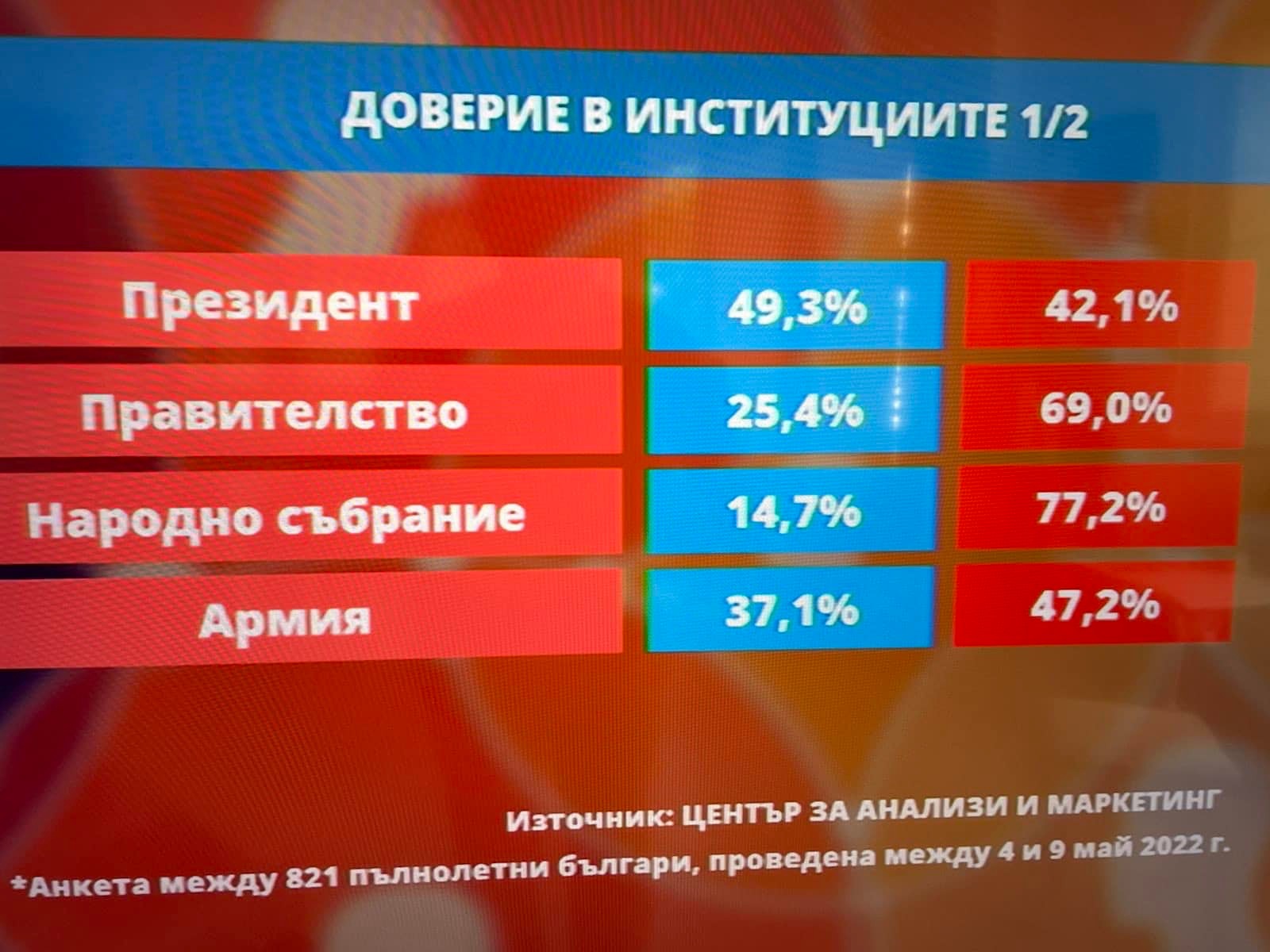 "Извън добрата новина, че ГЕРБ отчетливо е първа политическа сила в страната, данните от социологическото проучване на Центъра за анализи и маркетинг показват тежък срив на държавността у нас. Близо 70 на сто е недоверието на гражданите в правителството на България. А разликата между одобрението и неодобрението е повече от отрицателна - -45 пункта.