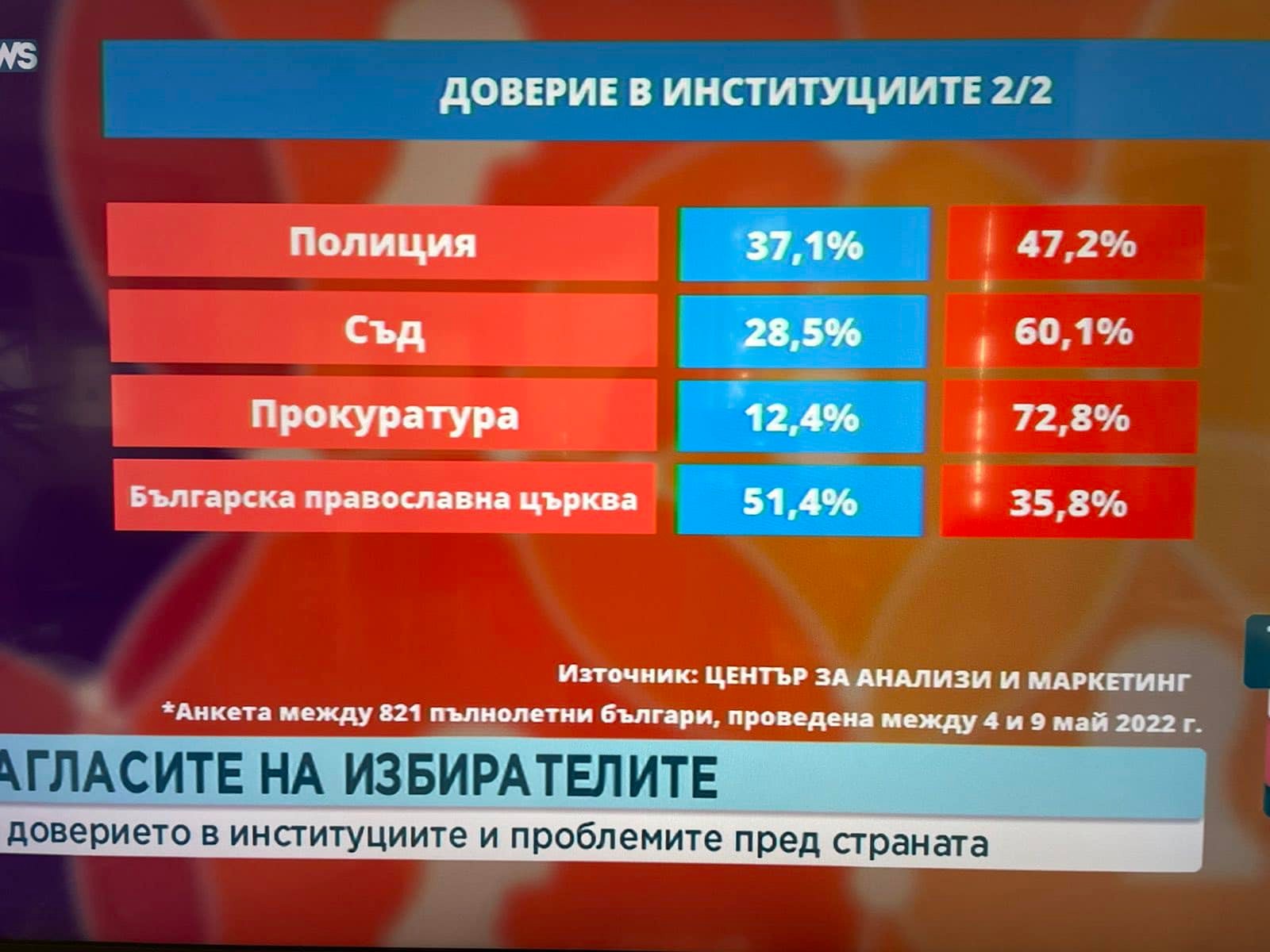 Да, това е резултатът от незаконните арести на партийни членове и активисти, включително на лидера на опозицията, и от "чегъртането" в тези две институции, които заедно с Църквата ни традиционно се радваха на високо обществено доверие и са в основата на българската държавност. Но така е, когато ни управлява ПП ПП - Про Правителството Продължава Подмяната", заяви Маринов в своя публикация в социалните мрежи.