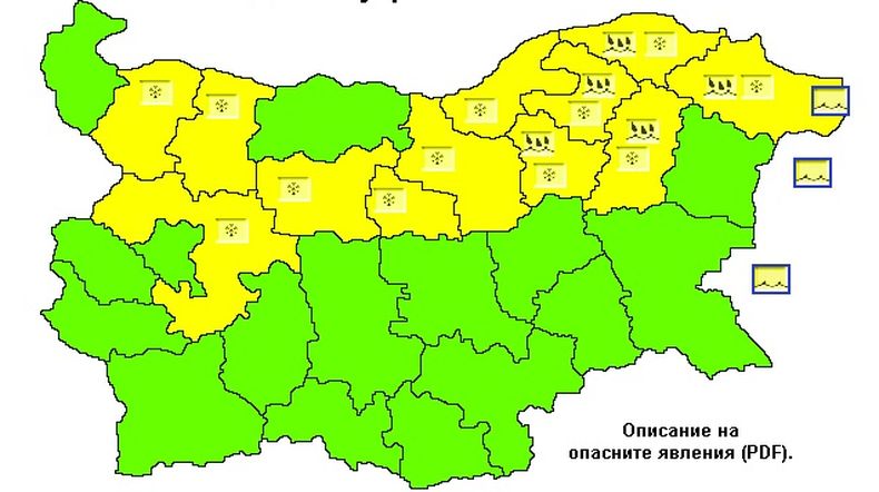 Предупреждението за интензивни снеговалежи важи за София-област и областите Монтана, Враца, Ловеч, Габрово, Велико Търново, Русе, Търговище, Разград, Шумен, Силистра, Добрич. Там се очаква в равнинните части снежна покривка между 5 и 10 см, а в планинските райони – до 15-20 см.