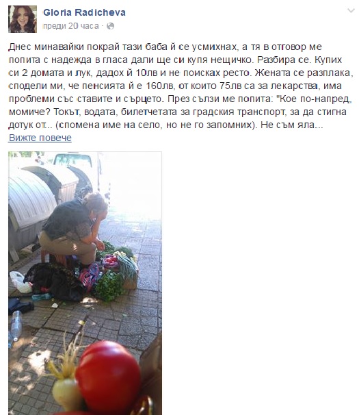 Днес минавайки покрай тази баба й се усмихнах, а тя в отговор ме попита с надежда в гласа дали ще си купя нещичко. Разбира се. Купих си 2 домата и лук, дадох й 10 лв. и не поисках ресто. Жената се разплака, сподели ми, че пенсията й е 160 лв., от които 75 лв. са за лекарства, има проблеми със ставите и сърцето.