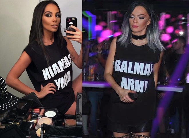 Одеждата е дело на френския бранд Balmain, решена е изцяло в черно, а в зоната на бюста има бяла щампа „Balmain Army”.
