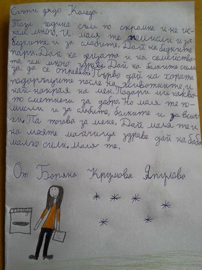 "Скъпи дядо Коледа, тази година съм по-скромна и не искам много. И моля те, помисли и за бедните и за слабите. Дай на бедните пари. Дай на децата и на семействата им много здраве. Дай на болните сили, за да се оправят", пише в писмото си момиченцето.