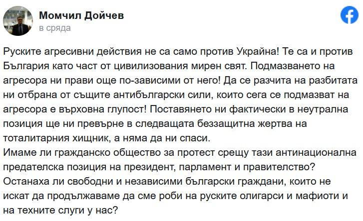 "Руските агресивни действия не са само против Украйна! Те са и против България като част от цивилизования мирен свят. Подмазването на агресора ни прави още по-зависими от него! Да се разчита на разбитата ни отбрана от същите антибългарски сили, които сега се подмазват на агресора, е върховна глупост! Поставянето ни фактически в неутрална позиция ще ни превърне в следващата беззащитна жертва на тоталитарния хищник, а няма да ни спаси.