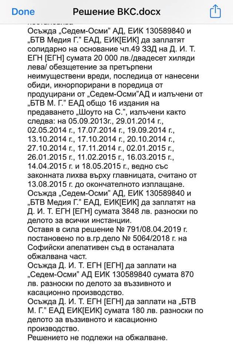 В становището на магистратите от последната инстанция се казва следното: ..."Седем-Осми" АД и "БТВ Медия Г" ЕАД се осъждат да заплатят солидарно на основание чл. 49 ЗЗД на Д.И.Т сумата 20 хиляди лева обезщетение за претърпени неимуществени вреди, последица от нанесени обиди, инкорпорирани в поредица от продуцирани от "Седем-Осми" АД и излъчени от "БТВ Медия Г" общо 16 издания на предаването "Шоуто на С.", ведно със законната лихва върху главницата, считано от 13.08.2015 г. до окончателното изплащане. Осъжда "Седем-Осми" АД и "БТВ Медия Г" да заплатят на Д.И.Т сумата от 3848 лв. разноски по делото за всички инстанции".