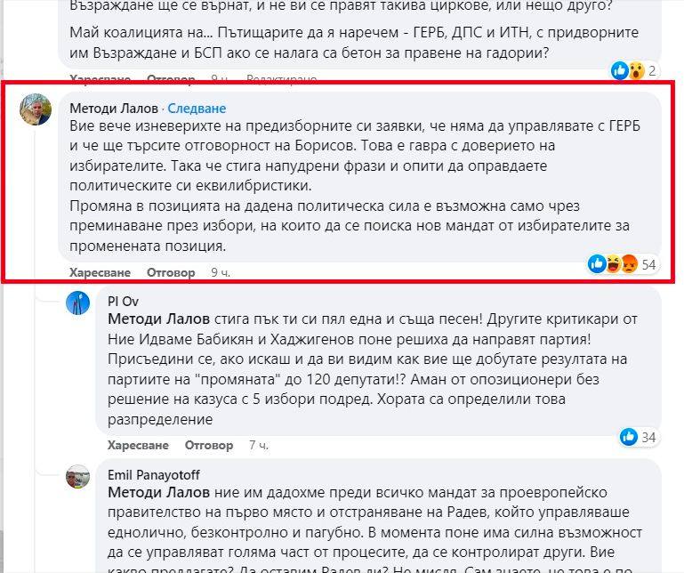 Да, ще видите лидерите и депутатите на ПП-ДБ да говорят с техните колеги лидери и депутати в Народното събрание- не в сараи и тъмни стаички. Да, ще има снимки и срещи. Защото това им е работата. Въпреки това чувството не е приятно, нито картината е красива. Не си правим илюзии и за цветя и рози. Обаче с 63-ма депутати така се реализира мандат за проевропейско правителство, вместо 6ти поредни избори. А има и закони да се гласуват. Ще ни атакуват и провокират всеки ден. Следете да не изневерим на законодателната и управленската програма.
