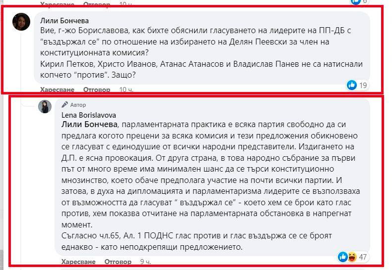 Мрежата гръмна след снощен пост на Лена Бориславов от ПП. Симпатизанти на партията гневно я нападнаха, питайки я защо Кирил Петков е гласувал въздържал се по отношение на членството на Делян Пеевски в комисията по конституционни въпроси в Народното събрание, който вчера бе одобрен за мястото.