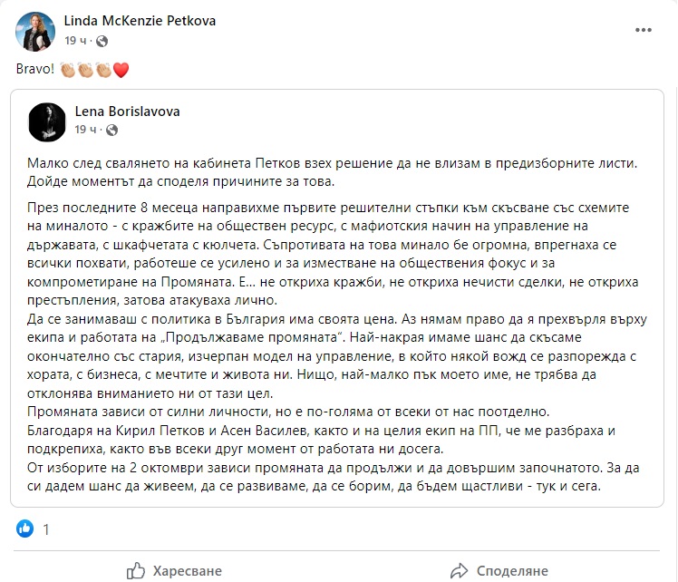 В част от публикациите се разпространява и снимка от профила на Линда. На снимката се вижда, че тя споделя поста на Лена с коментар "Bravo", последван от емотиконки на ръкопляскане и сърце.
