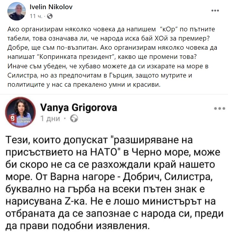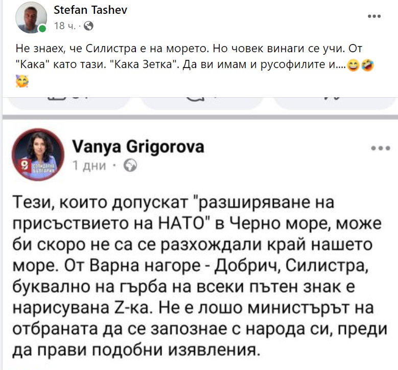 "Тези, които допускат "разширяване на присъствието на НАТО" в Черно море, може би скоро не са се разхождали край нашето море. От Варна нагоре - Добрич, Силистра, буквално на гърба на всеки пътен знак е нарисувана Z-ка. Не е лошо министърът на отбраната да се запознае с народа си, преди да прави подобни изявления", коментира на стената си Григорова, което предизвика подигравките на коментаторите.