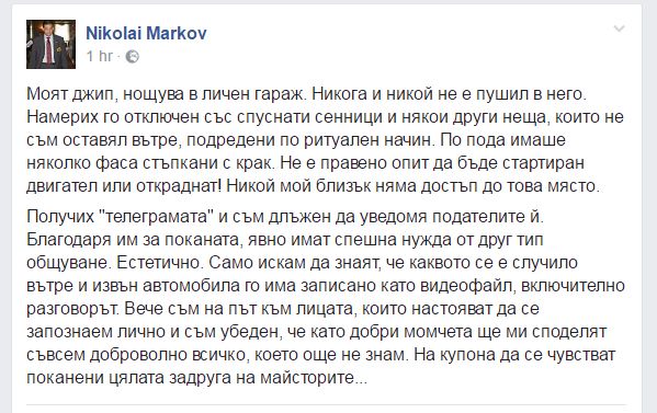 Получих "телеграмата" и съм длъжен да уведомя подателите й. Благодаря им за поканата, явно имат спешна нужда от друг тип общуване. Естетично. Само искам да знаят, че каквото се е случило вътре и извън автомобила го има записано като видеофайл, включително разговорът. Вече съм на път към лицата, които настояват да се запознаем лично и съм убеден, че като добри момчета ще ми споделят съвсем доброволно всичко, което още не знам. На купона да се чувстват поканени цялата задруга на майсторите...“, пише Марков.