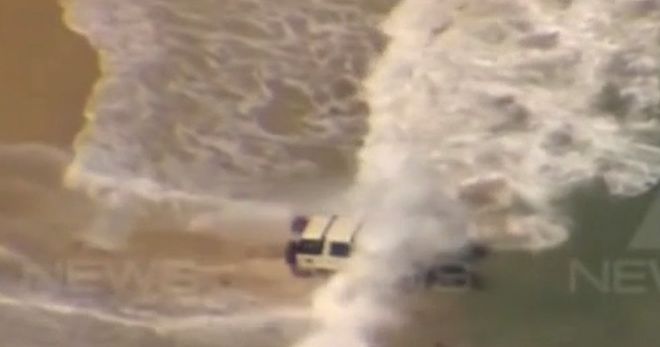Необичаен арест в Австралия. Мъж, преследван от полицията, се опита да избяга, влизайки с колата си в океана край град Пърт.
