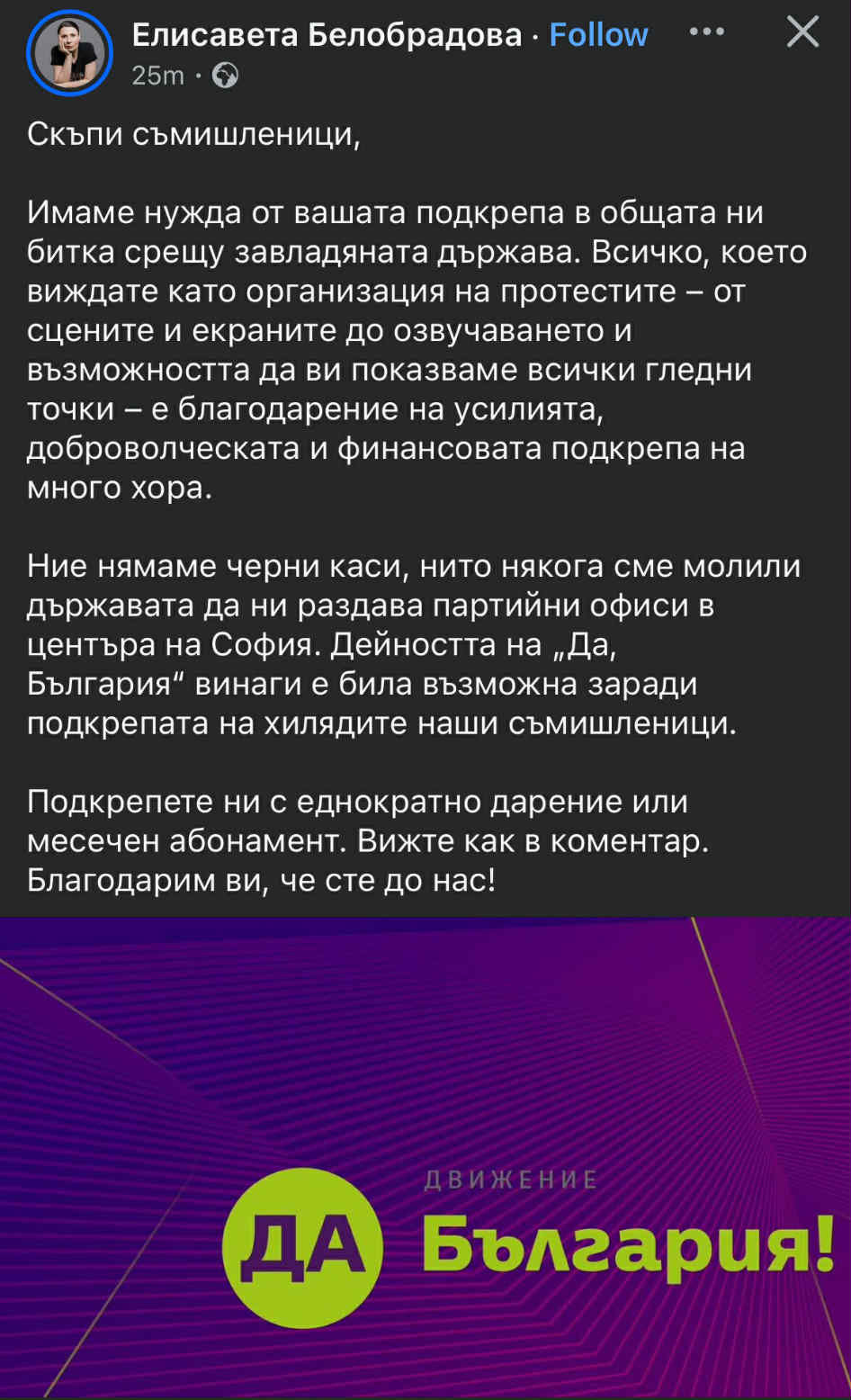В дълъг пост тя моли своите съмишленици за еднократно дарение или месечен абонамент към "Да, България", за да може коалицията да продължи да финансира метежите в центъра на София.