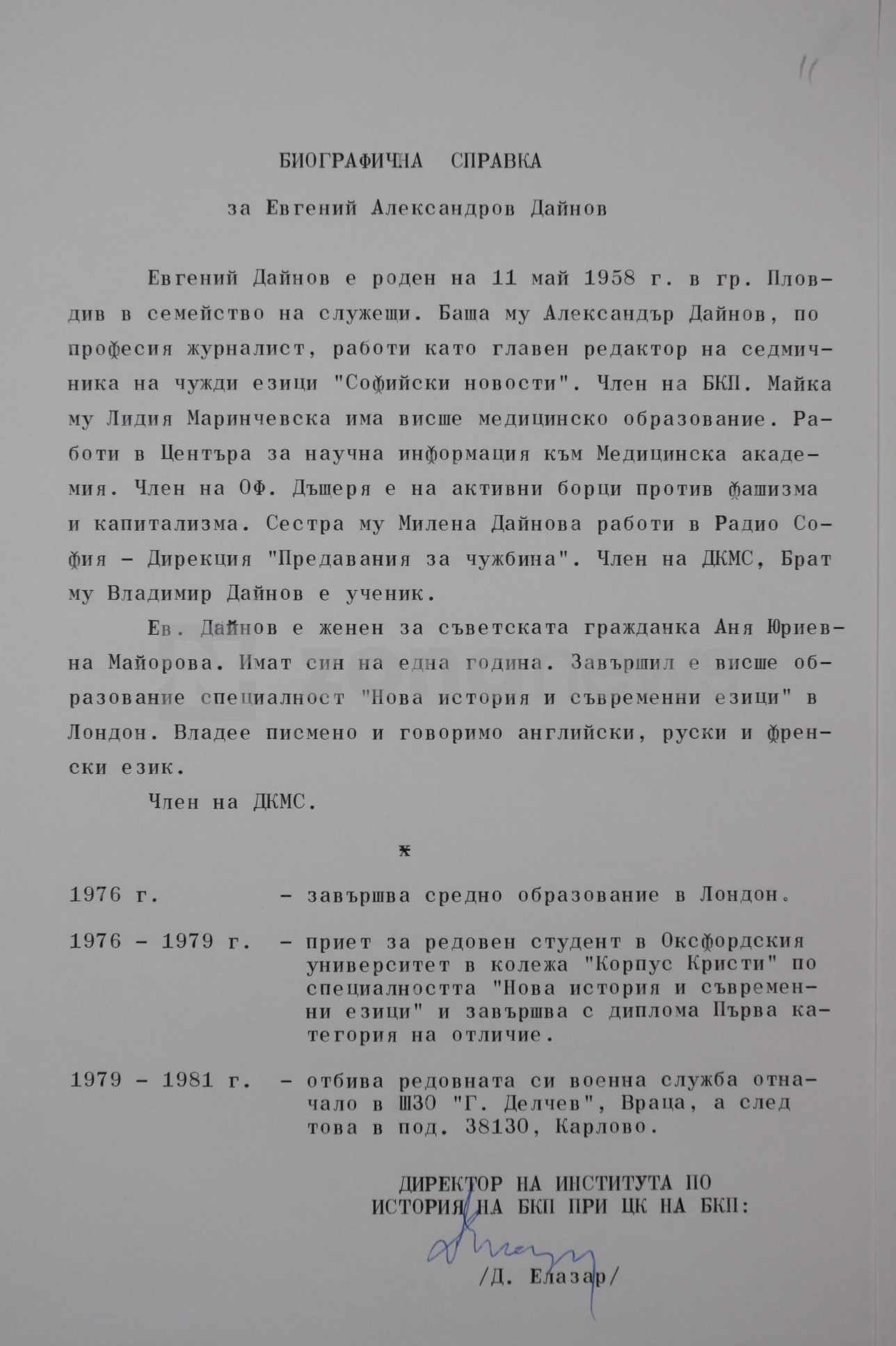 Кадровата справка на Евгений Дайнов от Института по история на БКП