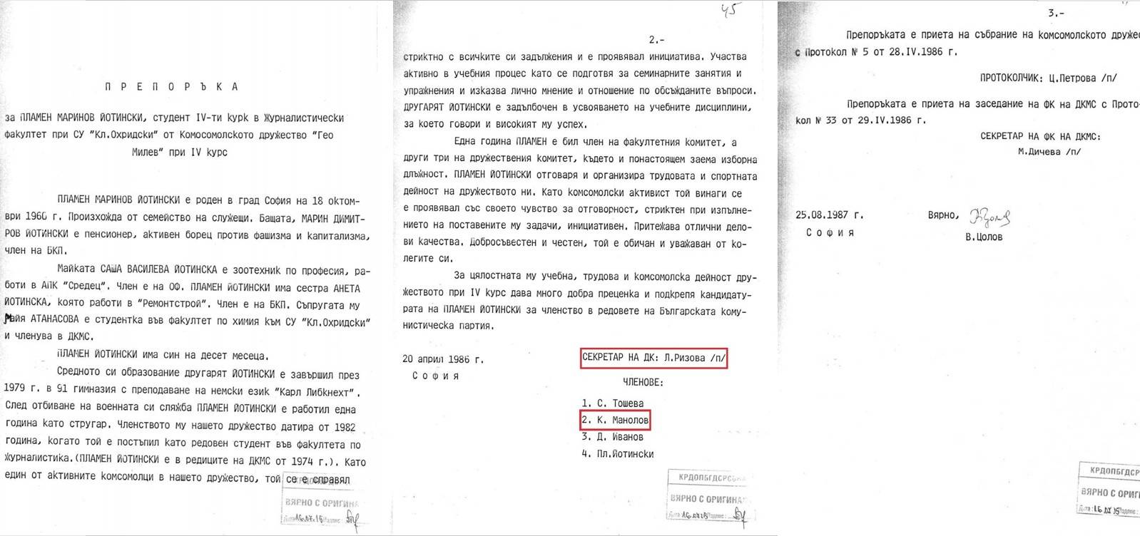 И така, какъв е бил преди 10 ноември днешният либертарианец Калин Манолов. Обикновена комсомолска номенклатура е бил, какъв друг може да е бил. Част от документите, които виждате са от архива на Комисията по досиетата. Те представляват характеристика на бившия кадрови офицер от ПГУ-ДС, отдел 8 (активни мероприятия) Пламен Йотински (днес международен редактор в БТА) за кандидатстването му в БКП, докато е бил студент по журналистика в СУ "Кл. Охридски". Под характеристиката стои името на другаря Калин Манолов, който през 1986-87 г. е член на Дружествения комитет на ДКМС във факултет "Журналистика" на СУ.