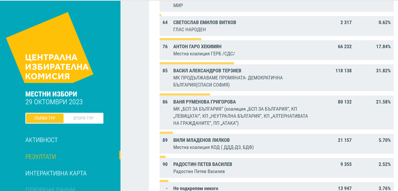 Към 19 часа при обработени 99,18 процента от протоколите ЦИК обявява, че Васил Терзиев продължава убедително да води с 31,82 процента, Ваня Григорова спада леко на 21,58, а Антон Хекимян качва до 17,84.