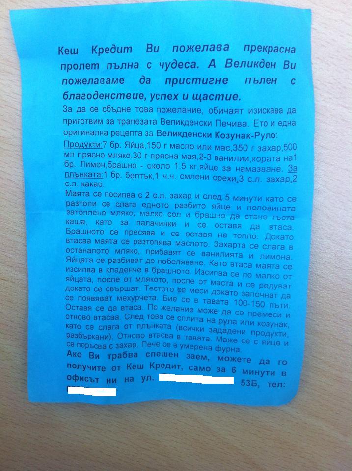 Обикновената синя листовка, с която фирмата е решила да се рекламира, приканва да прекараме един чудесен Великден с цялото семейство, което да зарадваме с домашен козунак. Обстойно дори е представена рецептата за направата на такъв (вижте снимката).
