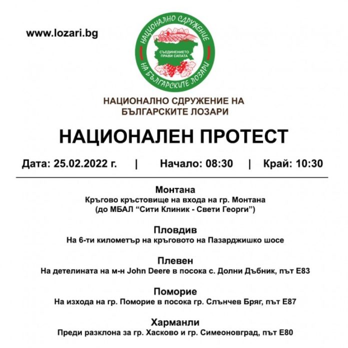 От „Национално сдружение на българските лозари“ излизат на протест, като членовете на организацията от цялата страна ще блокират с трактори и коли важни пътни артерии на страната в района на градовете Пловдив, Монтана, Плевен, Поморие и Харманли. Мероприятието ще се състои на 25.02.2022 г. (петък) и ще продължи два часа – от 08:30 ч. до 10:30 ч.
