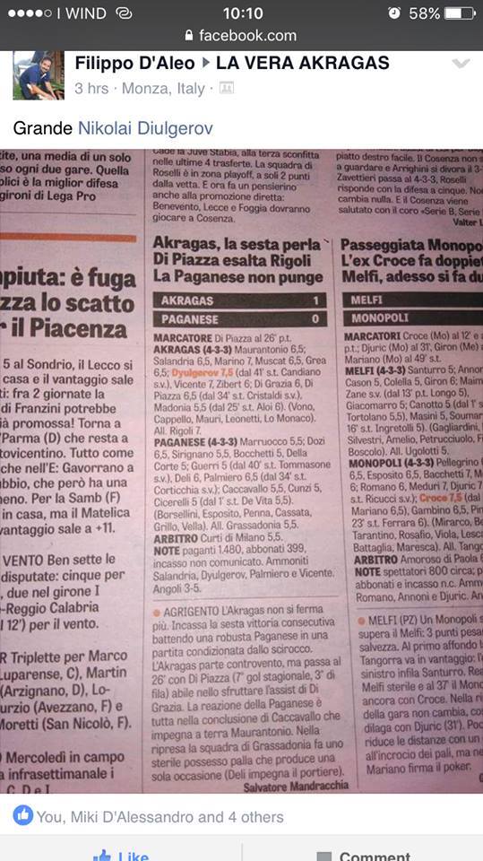 Бившият футболист на ЦСКА Николай Дюлгеров прави фурор макар и в трета дивизия на Италия. Роденият през 1988 година футболист премина в Акрагас през зимата. Преди трансфера му тимът беше в зоната на изпадащите и се бореше за спасение. Сега отборът нареди шест поредни победи и вече е на девето място. В последния двубой Акрагас победи с минималното 1:0 Паганезе.