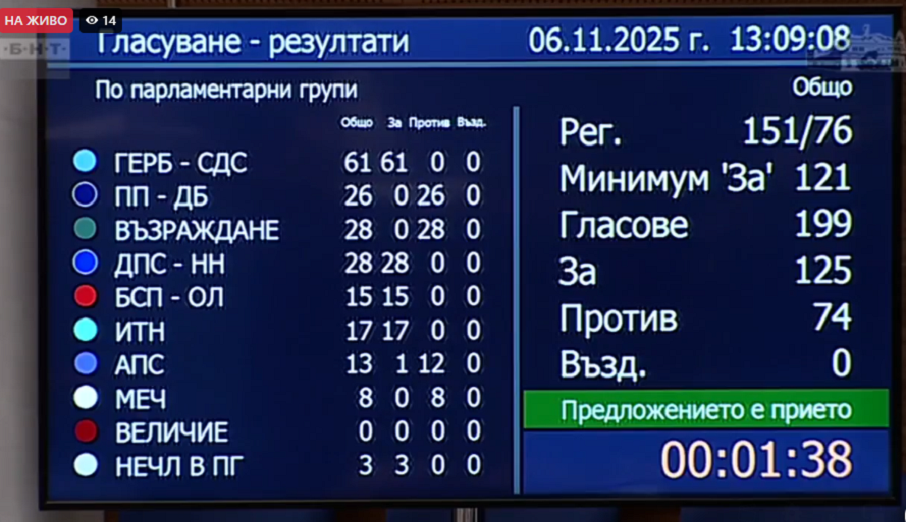 Със 125 гласа за, Народното събрание отхвърли ветото на Румен Радев на Закона за насърчаване на инвестициите.
