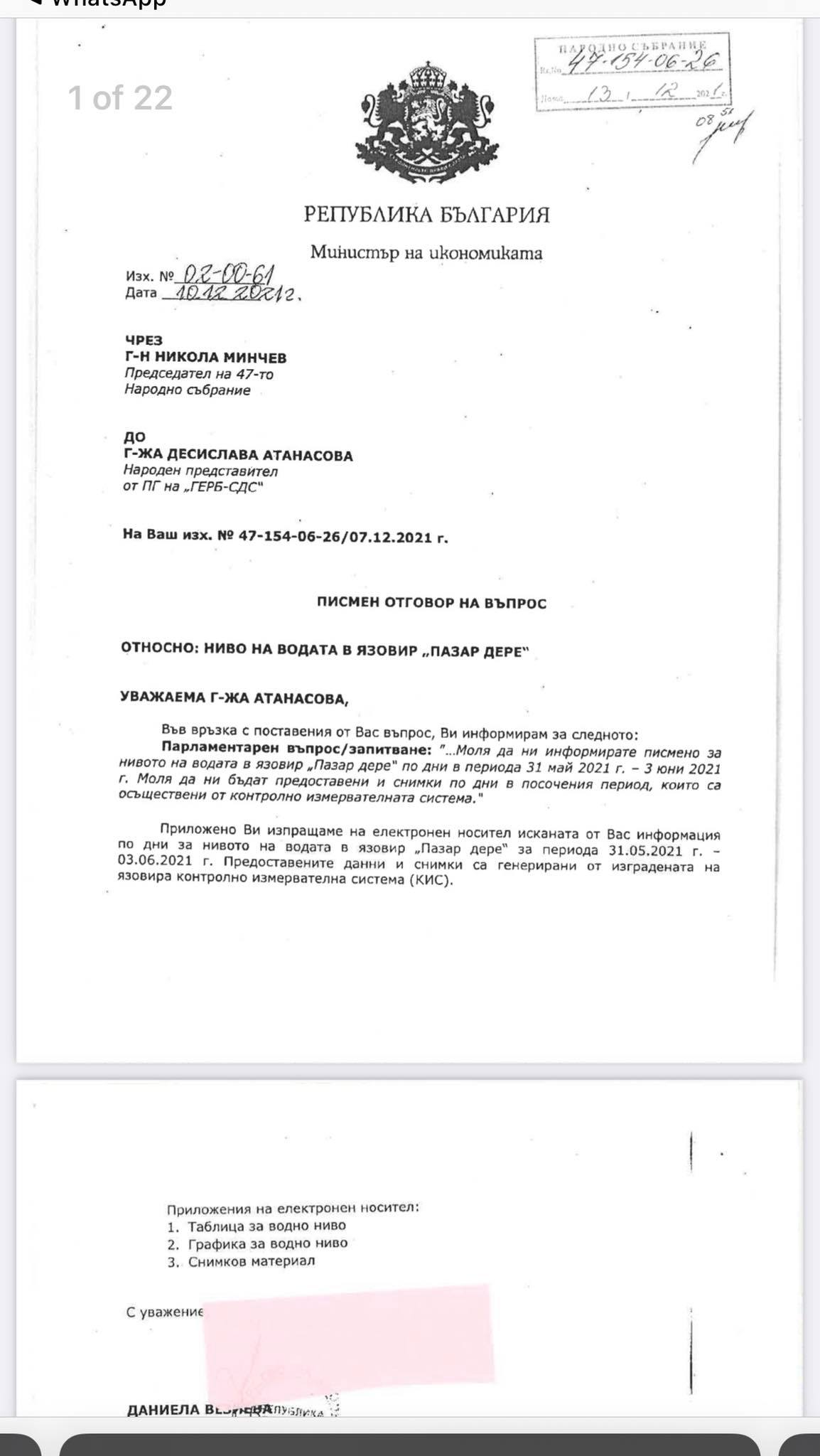 От партията на Борисов са поискали официално от министерство на икономиката данни за нивото на язовир “Пазар дере“ за периода 31 май-3 юни 2021 година и снимки за състоянието. От отговора на Даниела Везиева става ясно, че язовирът, от който започна рекламната кампания на Кирил Петков като министър на икономиката, е източен за три дни от ниво 1,54 метра над мъртвия обем на 31 май до 0,7 метра вечерта на 3 юни. Везиева е предоставила графики по часове за посочените дни.