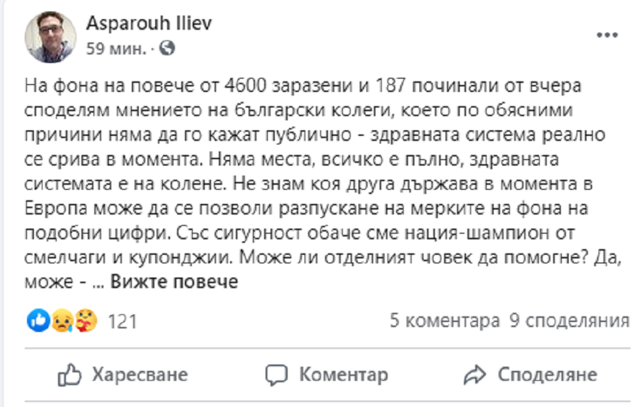 На фона на повече от 4600 заразени и 187 починали от вчера споделям мнението на български колеги, което по обясними причини няма да го кажат публично - здравната система реално се срива в момента. Няма места, всичко е пълно, здравната системата е на колене. Това заяви д-р Аспарух Илиев, директор на лаборатория в Университета в Берн, който подробно следи и ситуацията с коронавируса у нас.
