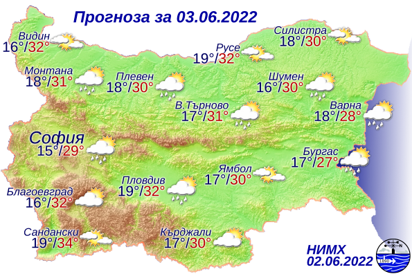 Днес преди обяд времето ще е предимно слънчево. След обяд ще се развива купеста облачност и на места ще има краткотрайни валежи, в отделни райони придружени с гръмотевици. Ще духа слаб, в източните райони до умерен североизточен вятър. Максималните температури ще бъдат между 29 и 3 градуса, в София - 29. Това съобщават от Националния институт по метеорология и хидрология (НИМХ).