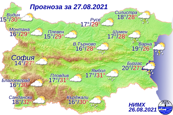 През днешния ден преди обяд над Дунавската равнина, а след обяд на места и в западната половина от страната ще има значителни намаления на облачността до предимно слънчево време. Ще духа слаб до умерен вятър от изток-югоизток. Максималните температури ще бъдат между 27° и 32°. Атмосферното налягане е по-ниско от средното за месеца и още ще се понижи. Това съобщават от Националния институт по метеорология и хидрология (НИМХ).