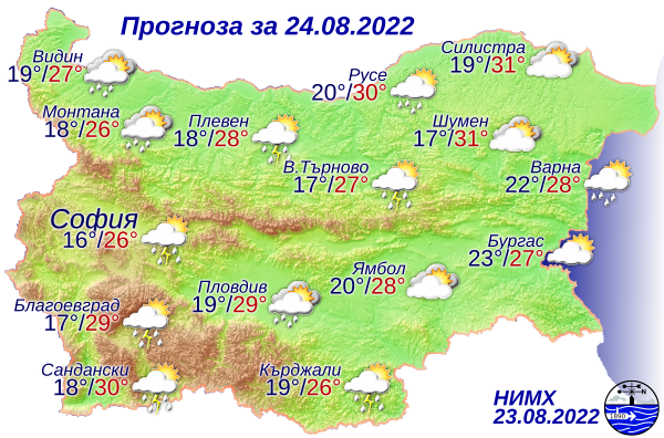 Сутринта на днешния ден облачността временно ще се разкъса и намалее, но покрай Дунав видимостта ще бъде намалена. През деня облачността ще бъде предимно значителна, в следобедните часове и до полунощ ще е купесто-дъждовна. На много места ще има краткотрайни валежи от дъжд придружени с гръмотевици. Дневните температури слабо ще се повишат и максималните ще са предимно между 26° и 31°, в София - около 26°. Това съобщиха от Националния институт по метеорология и хидрология (НИМХ).