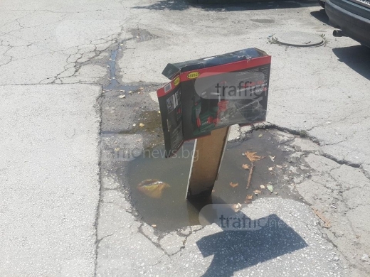 Гигантска дупка зейна на улица „Васил Левски” в Кършияка в Пловдив. От дни в нея се събира вода и заплашва водачите на автомобили от пропадане в нея. Пострадал от внушителния й размер е решил да сигнализира за неравността с подръчни материали - дъска и кашон, съобщава трафикнюз.