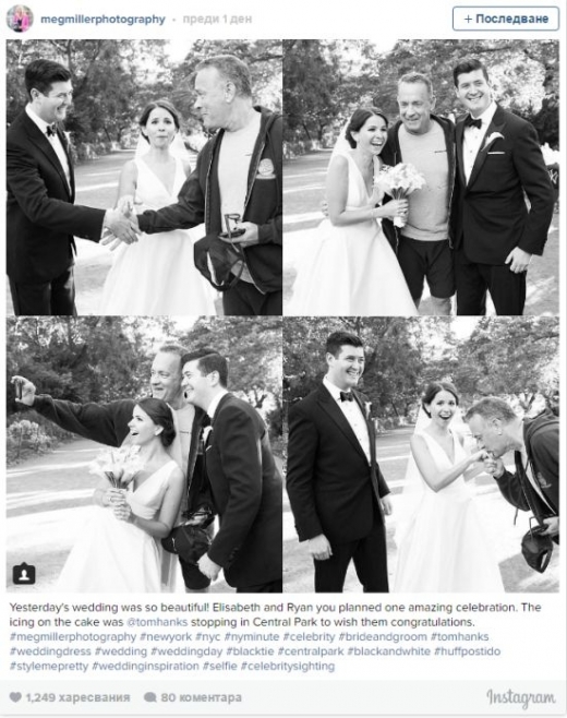 Том Ханкс се приближил към двойката и поискал да се снима с тях, да си направи селфи, след което качил кадрите в профила си в Twitter. Фотосите моментално предизвикали небивал интерес. Младоженците останали силно впечатлени от искреността и човечността на големия актьор, който дори целунал ръка на булката.