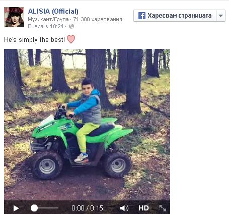 Синът на Алисия и Валери Божинов показва заложби на автомобилен състезател. Самата Алисия с изключителна радост и задоволство снима сина си, докато управлява автомобила. И дори пусна видеото в социалната мрежа, за да се похвали колко е добър малкия Валери.